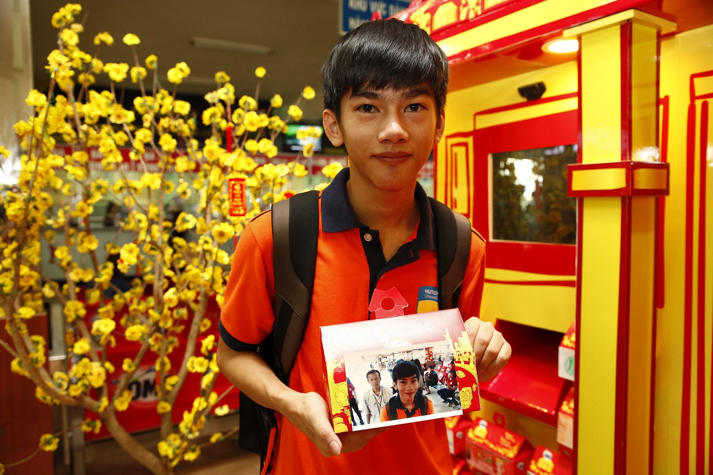 | Bạn Lê Văn Thắng (sinh viên năm nhất) và hộp quà sum họp có hình ảnh của minh. |