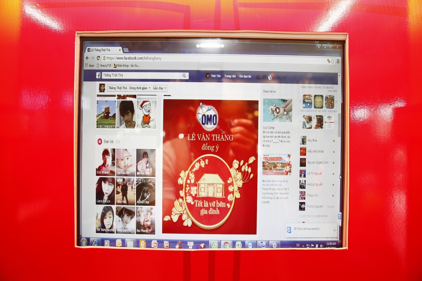 Bức ảnh sẽ được in ra và dán bên ngoài hộp quà cùng với những lời nhắn gửi yêu thương dành cho người thân gia đình. Bên cạnh đó, ngay cạnh góc OMO chụp hình, bạn có thể ghi âm lại lời ước nguyện dành cho ông bà, cha mẹ mình.