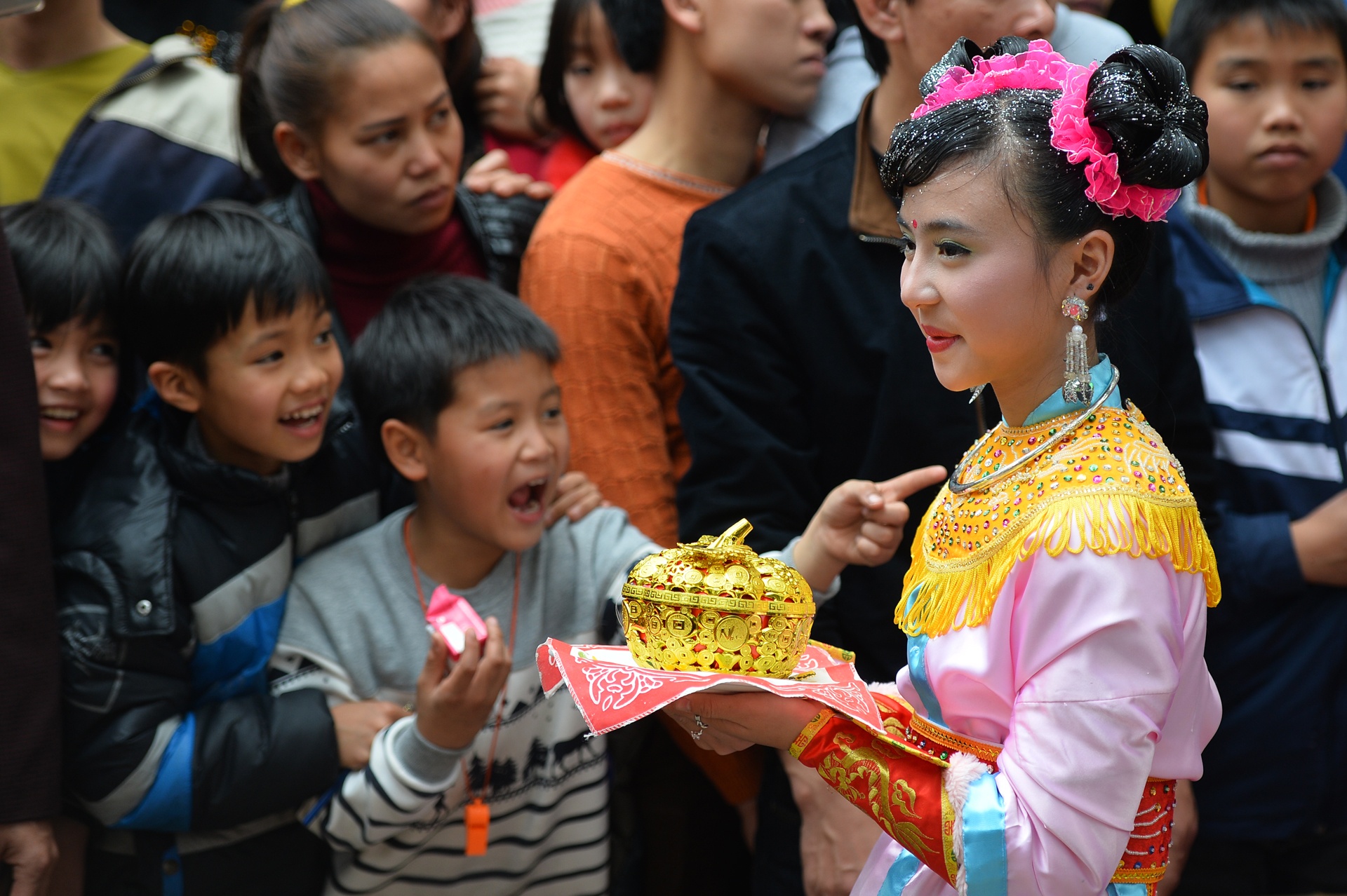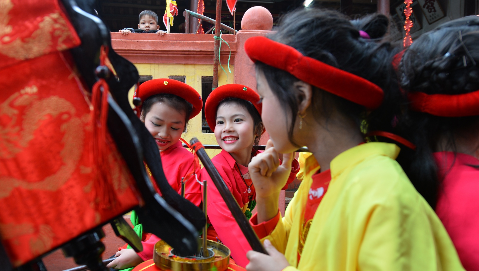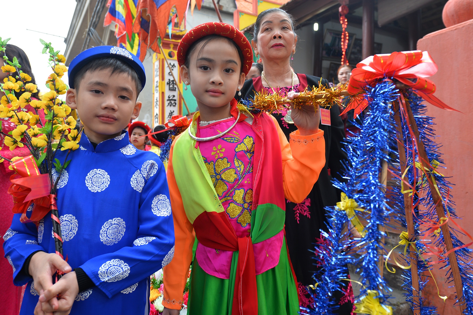 | Hai bé Trịnh Hưng (8 tuổi) và Khánh Ly (7 tuổi) có vinh dự được gánh lộc cho làng. Năm nay, các thành phần tham gia chính đều là người của xóm 1, làng Thổ Hà. |