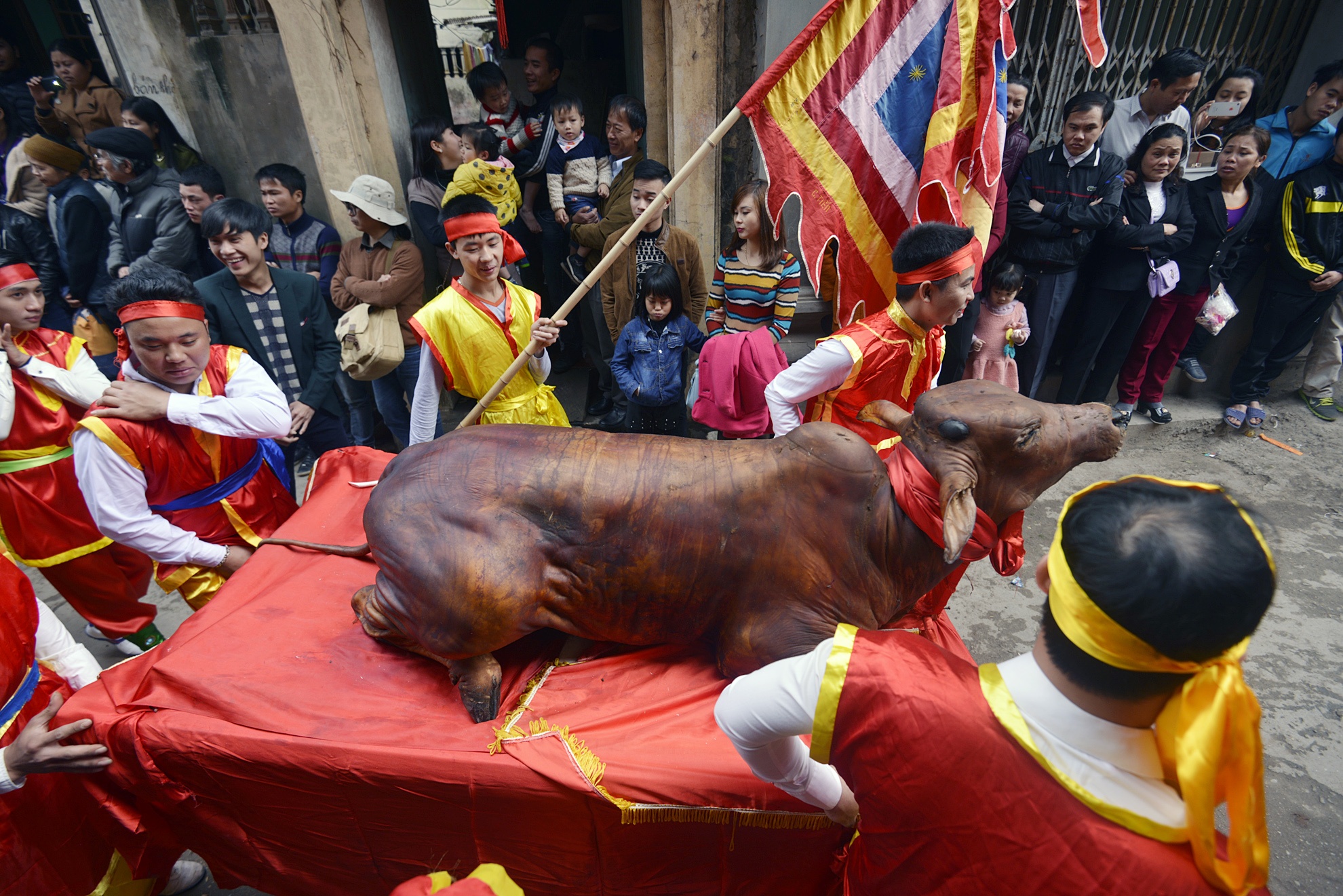 Trong lễ rước còn có cả một con bê đã thịt còn nguyên hình.