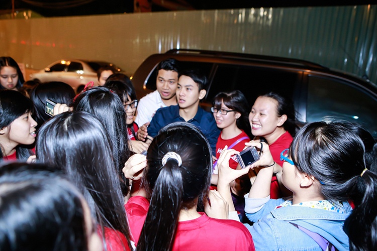 | Nam ca sĩ Hoài Lâm được fan bủa vây khi vừa xuống xe đến rạp. |