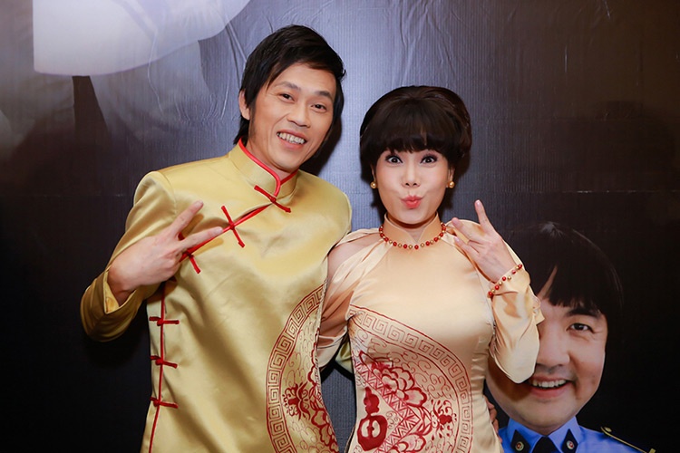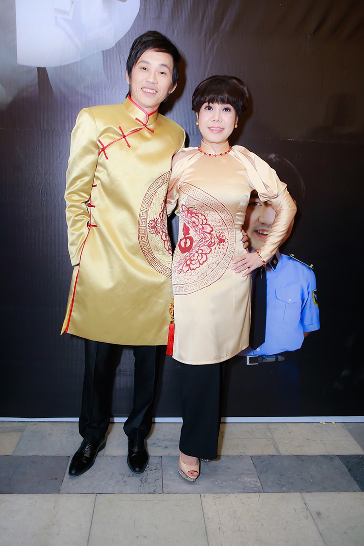 | Hai danh hài Hoài Linh và Việt Hương tiếp tục diện áo dài đôi được may trên cùng một mảnh vải đến sự kiện. Việc thường xuyên diện đồ cặp khẳng định mối quan hệ khăng khít, thân thiết của hai diễn viên nổi tiếng. |