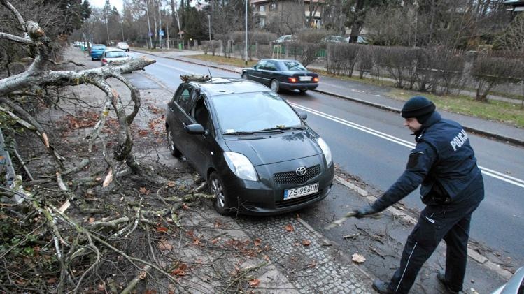 Cảnh sát xem xét hiện trường sau khi cây đổ và đè vào ô tô ở thành phố Szczecin, Ba Lan vì bão Xaver hôm 6/12. Ảnh: Reuters