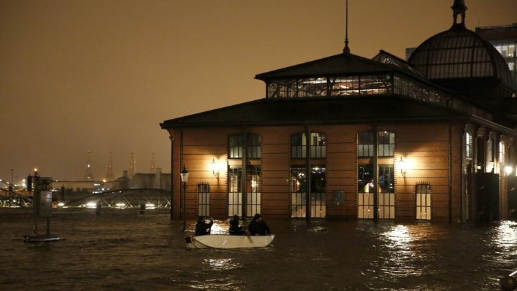 Nước tràn vào nhiều khu vực trong thành phố cảng Hamburg, Đức nên người dân phải di chuyển bằng thuyền. Ảnh: Reuters