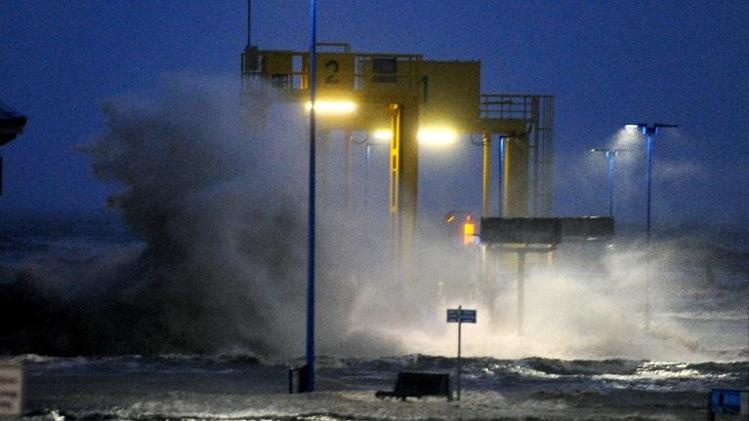 Sóng ập vào bến phà ở thành phố Dagebuell, Đức. Ảnh: Reuters