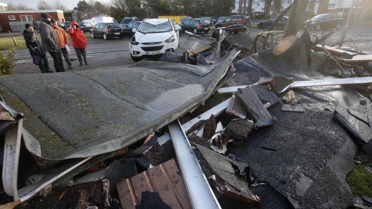 Gió thổi bay mái nhà và làm hỏng nhiều ô tô tại thành phố Cuxhaven, Anh hôm 6/12. Ít nhất ba người tại Anh đã thiệt mạng vì bão Xaver. Ảnh: Reuters