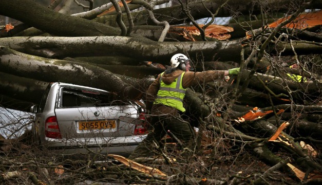 Cây đổ và đè lên xe hơi trong bão tại thành phố Edinburgh, Scotland. Ảnh: AP