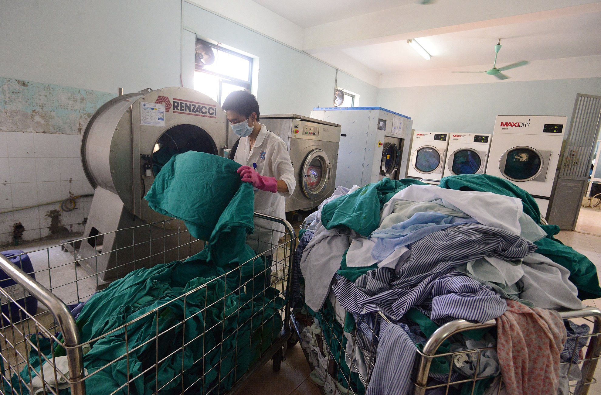 Nhân viên Bùi Đức Hải, phòng quân trang (thuộc khoa kiểm soát nhiễm khuẩn) đang kiểm tra, phân loại quần áo, trước khi cho vào lò giặt. "Nếu chiều nay không có nước, toàn bộ số quần áo bệnh nhân, bác sĩ sẽ không được làm sạch", anh Hải nói.