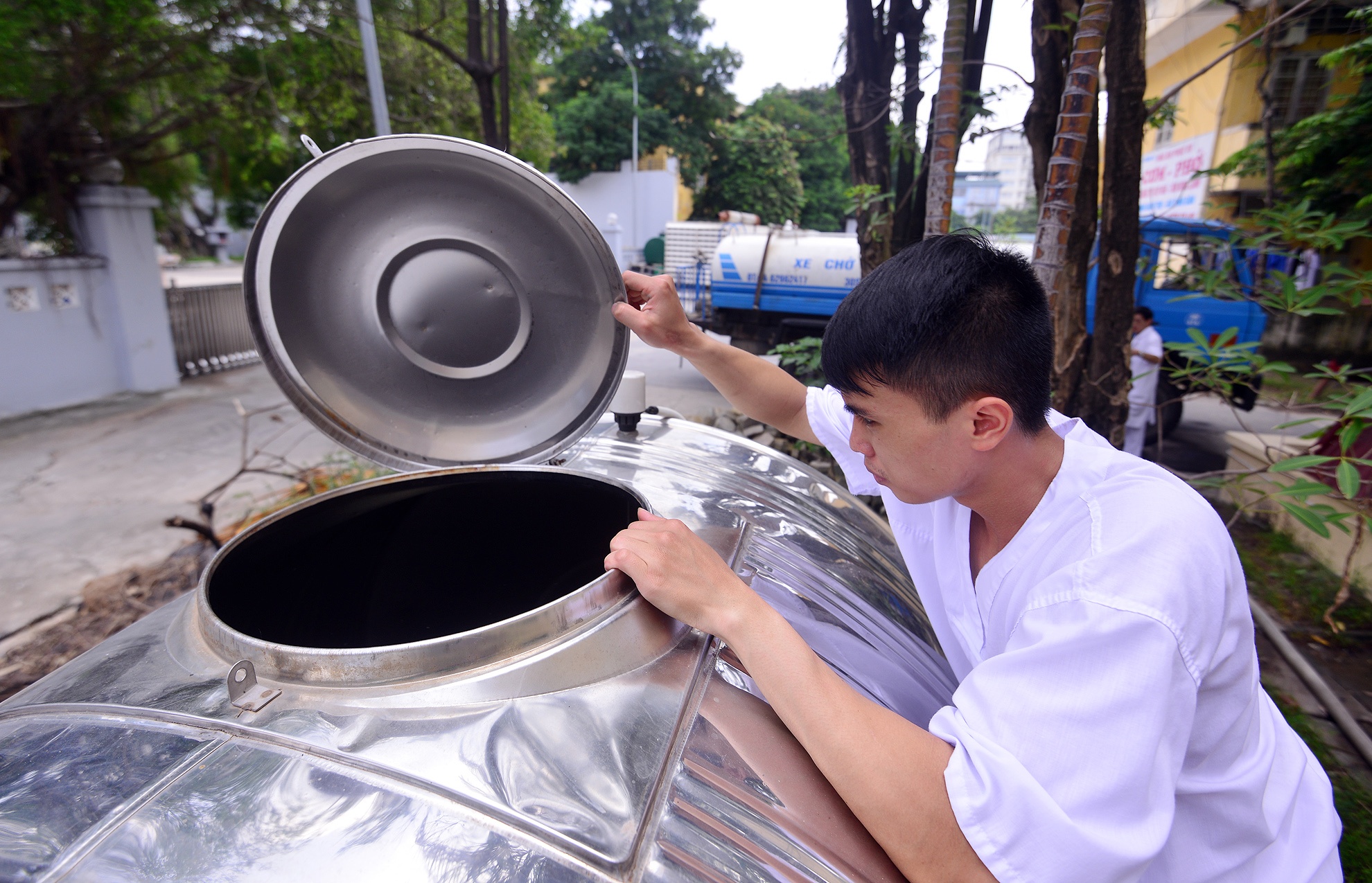 Hàng ngày, nhân viên Nguyễn Minh Chí (làm việc tại khu kiểm soát nhiễm khuẩn) phải đi kiểm tra các bồn nước dự trữ. Anh cho biết, nếu chiều 28/9 không được cấp thêm, bể nước này sẽ cạn.