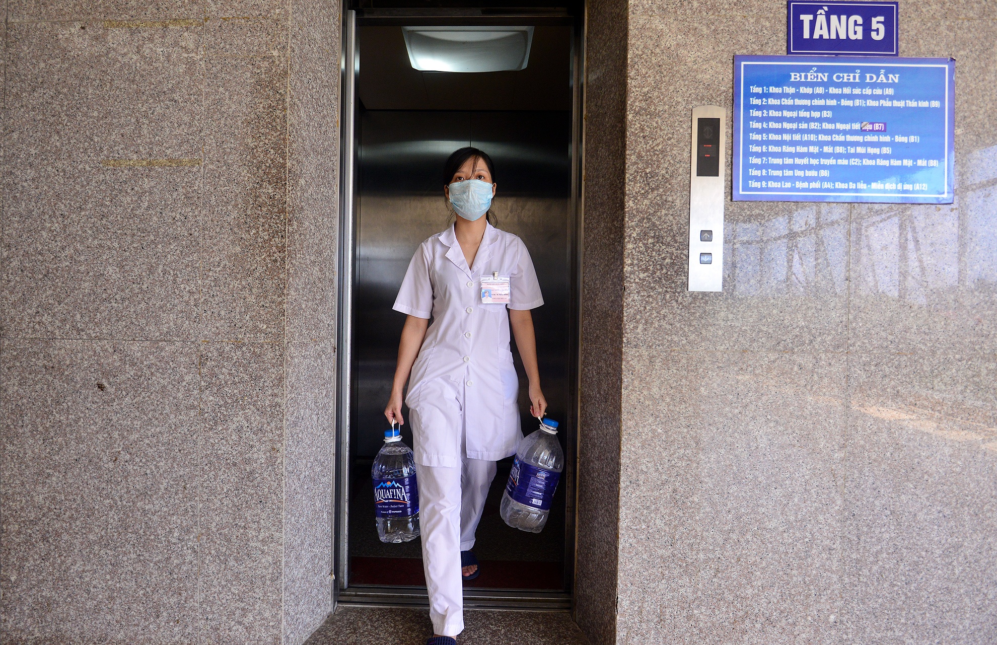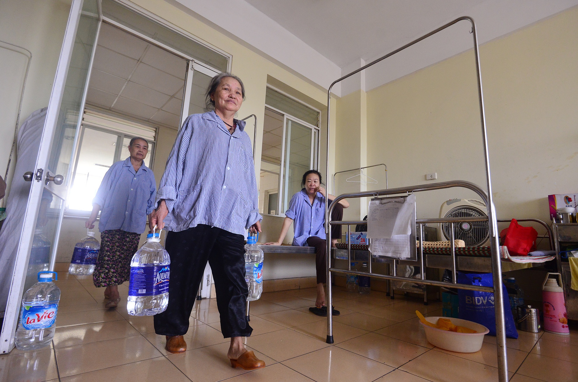 Do mất nước 3 ngày, nhiều bác sĩ, y tá Bệnh viện 198 (Hà Nội) phải dùng xô và can xuống tầng 1 lấy nước. Trong phòng bệnh cũng ngổn ngang hàng loạt bình dự trữ.
