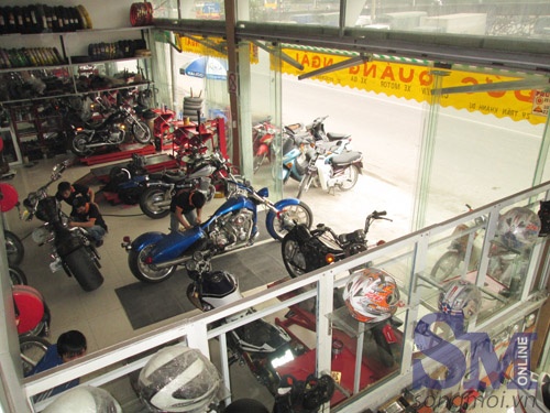 Một góc cửa hàng sửa xe kiêm cung cấp phụ tùng, đồ chơi cho dân chạy Harley của Đức “Quảng Ngãi”. |
