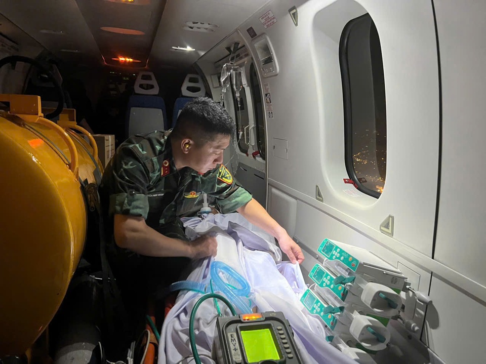 Khoảng 23h, trực thăng cất cánh đưa bệnh nhân trở về TP.HCM. Suốt hơn ba giờ bay đêm, hai bác sĩ luôn túc trực bên bệnh nhân, duy trì thở máy, truyền dịch, kiểm soát sốc và theo dõi sinh tồn từng phút.