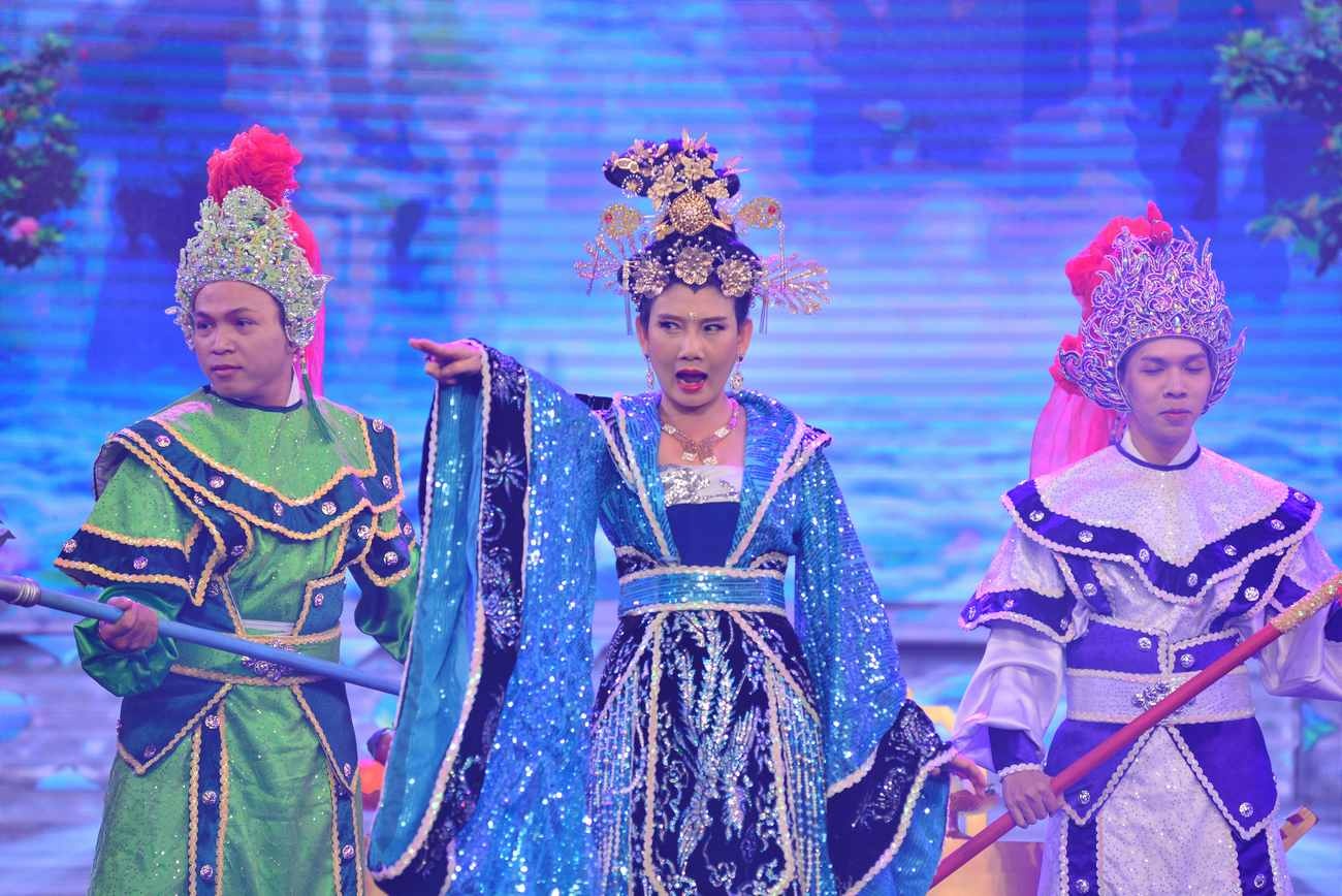 Lê Khánh - Đình Toàn kết hợp cùng Hải Triều trong vở Lúng la lúng liếng. Nam nghệ sĩ trẻ hóa thành bà Chúa Xuân mang tình yêu đến cho muôn loài. |