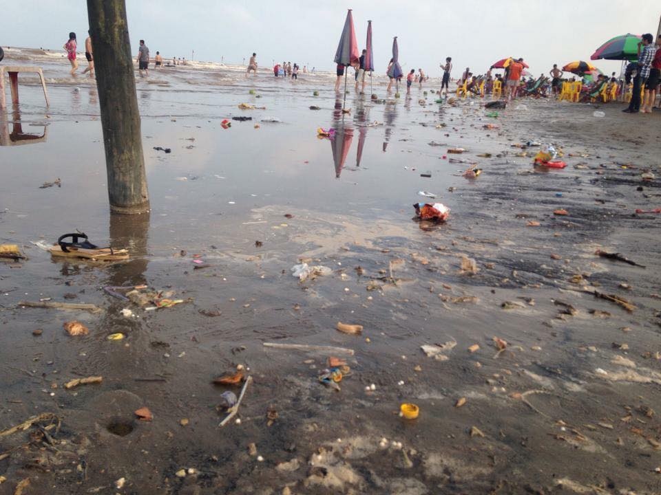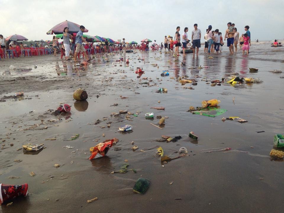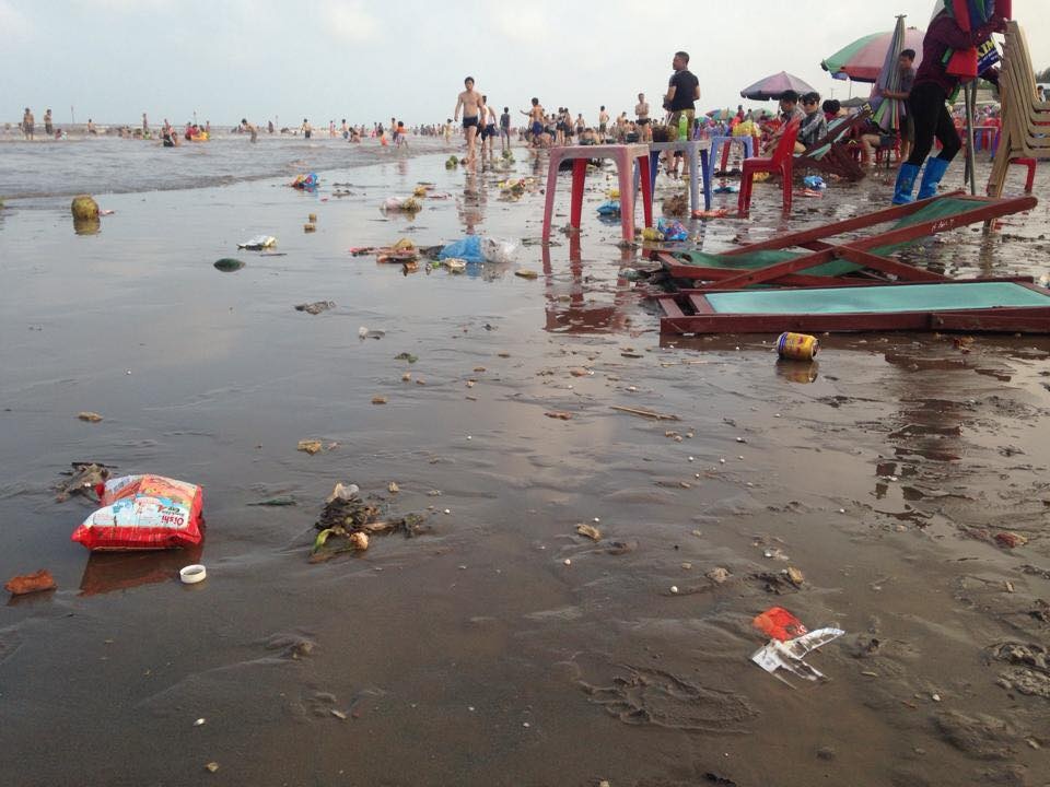 Tuy nhiên, độc giả Đinh Tuấn cho rằng: "Cái này là đặc sản Cồn Vành rồi. Ngoài vấn đề ý thức ra thì do đặc thù ở đây bờ biển thoải dài, thủy triều lên là ngập hết cả chỗ bán hàng, cuốn hết cả rác ra biển mà không kịp dọn dẹp. Sáng hôm sau biển lại trả lại một đống thế này ".Ảnh: Trần Hoàng Yến. |