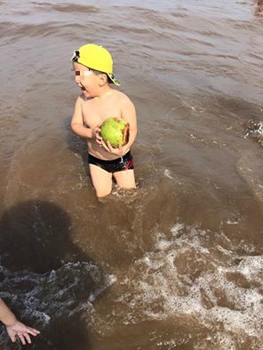 | Một em bé thích thú khi nhặt được vỏ quả dừa khi đang tắm. |