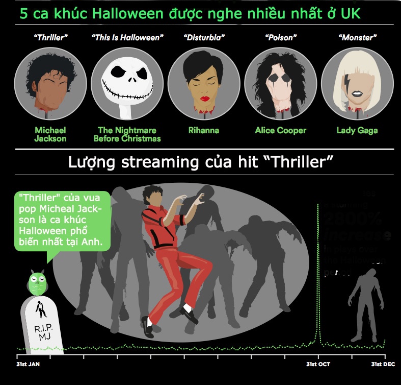 Tại Anh Quốc, Thriller của Michael Jackson là ca khúc halloween được nghe nhiều nhất trong suốt nhiều năm vừa qua. Michael đã qua đời, hit Thriller cũng ra đời hơn 3 thập kỷ nhưng ca khúc chưa bao giờ giảm nhiệt.