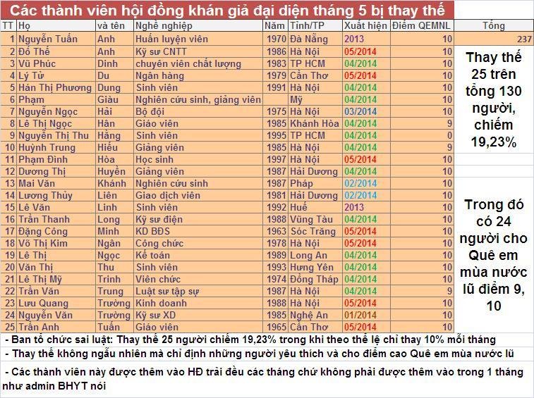 | Thành viên trong hội đồng khán giả đại diện bị thay thế chiếm tới 20% thay vì 10% như thể lệ. Trong đó có tới 24 thành viên ủng hộ Quê em mùa nước lũ và cho điểm cao. |
