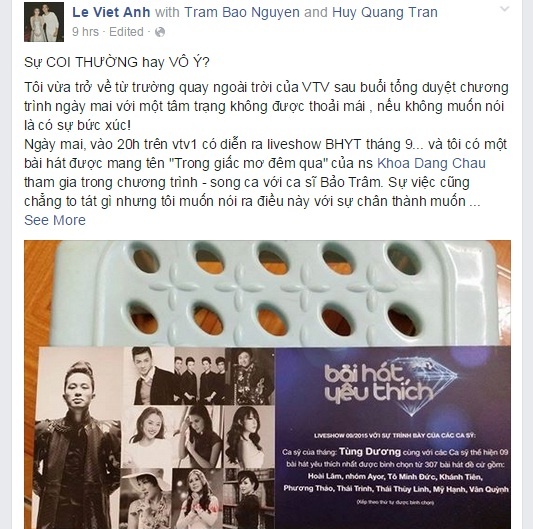 Tối 17/9, ca sĩ Lê Việt Anh đã chia sẻ bức xúc trên trang cá nhân về việc ban tổ chức (BTC) chương trình Bài hát yêu thích (BHYT) không đưa hình ảnh và thông tin về tiết mục song ca ca khúc Trong giấc mơ đêm qua (Châu Đăng Khoa) của anh cùng nữ ca sĩ Bảo Trâm vào vé mời live show tháng 9.