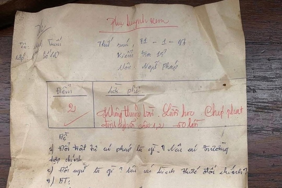 Đây là bài kiểm tra 15 phút môn Ngữ pháp dành cho học sinh lớp 8. Nét chữ nghiêng, được viết bằng mực xanh của "cựu học sinh" Minh Tuấn vẫn còn rõ nét. Góc trên cùng của bài làm ghi rõ lời phê của giáo viên bằng mực đỏ: “Không thuộc bài. Lười học. Chép phạt định nghĩa câu 1, 2 - 50 lần”.