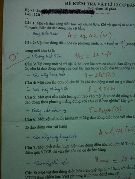 Tuy mới xuất hiện trên mạng xã hội nhưng bài kiểm tra đã thu hút gần 2.000 lượt like (thích) của cư dân mạng. Bức ảnh chụp lại một bài kiểm tra Vật lý 12 cơ bản, thời gian 15 phút, tên học sinh đã được giấu.