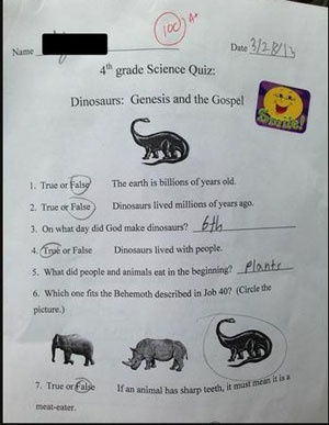 Khủng long đi dạo với con người, Chúa tạo ra khủng long vào ngày mồng 6… loài động vật khổng lồ được nói đến trong cuốn sách có tên “Bible’s Book of Job” là một loài khủng long ăn thực vật. Những thông tin đi ngược lại với những bằng chứng khoa học này cũng xuất hiện trong một bài kiểm tra môn Khoa học lớp 4 của một trường tôn giáo tư nhân của Mỹ.