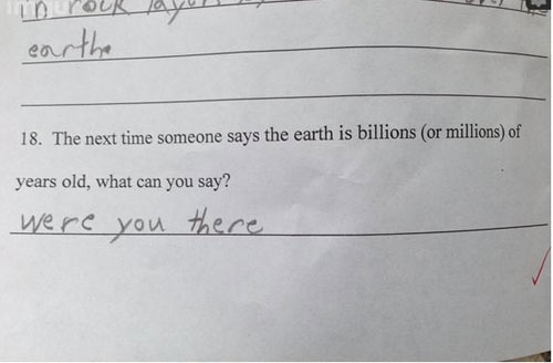 Người đọc này còn gửi bức ảnh chụp mặt sau của bài kiểm tra, có thêm một câu hỏi: “Lần sau nếu có ai đó nói Trái đất hàng tỷ (hoặc hàng nghìn) năm tuổi, bạn sẽ nói gì?” Câu trả lời là: “Bạn có ở đó không?”.
