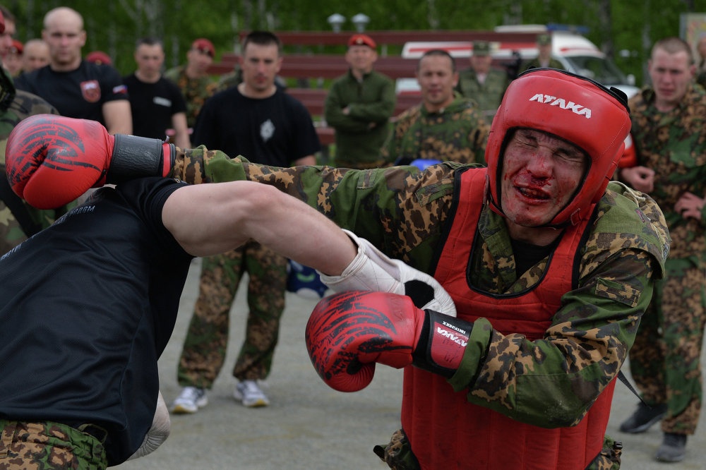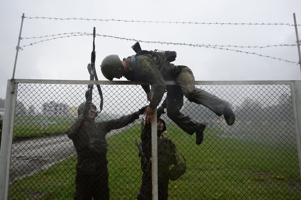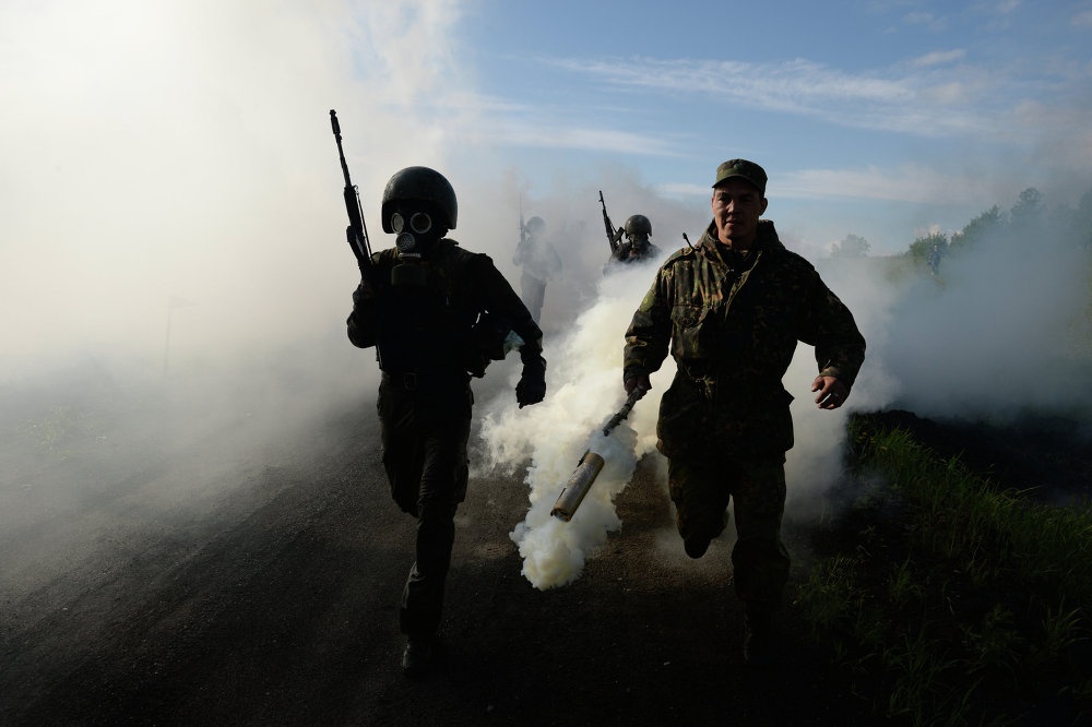 Buổi kiểm tra thành viên đội đặc nhiệm Spetsnaz diễn ra tại thao trường Gorny, vùng Novosibirsk. Các binh sĩ phải chứng minh rằng họ đủ tiêu chuẩn để nhận mũ nồi đỏ và vinh dự khi đứng trong hàng ngũ của đội đặc nhiệm ưu tú. |