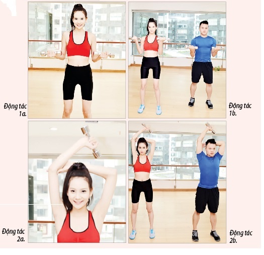 Chuẩn bị: Hai chân rộng bằng vai. Hai đầu gối hơi chùng xuống. Hóp bụng và ưỡn ngực. Tay cầm tạ đưa lên cao, giữ thẳng. Tay còn lại vòng qua đầu và giữ phần cùi trỏ.