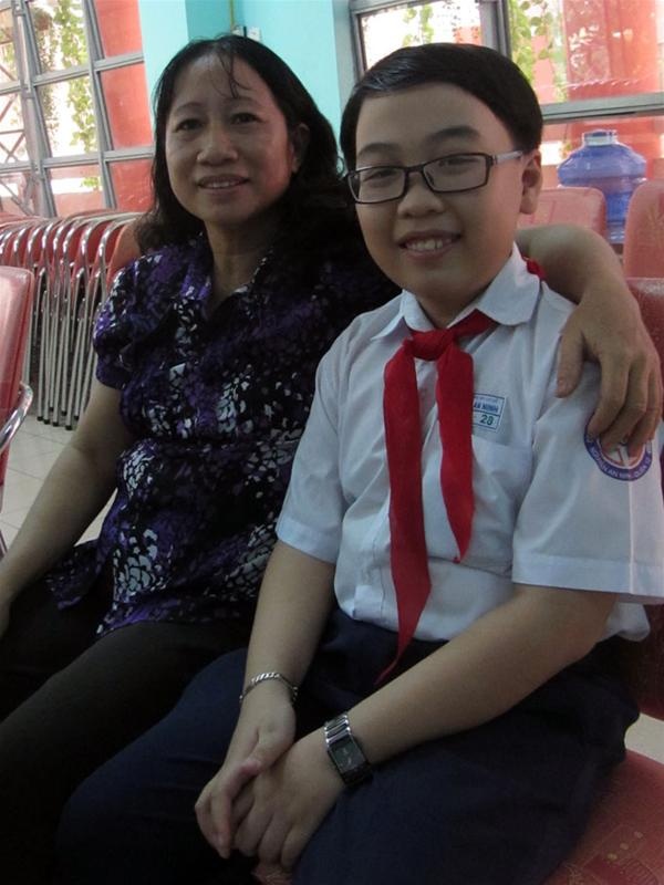 | Tô Nguyễn Minh Nhựt - tác giả bài văn xúc động được 4,75 điểm (thang điểm 5) và cô giáo dạy văn Trần Thị Tỉnh. |