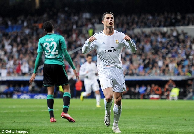 Với 2 pha lập công vào lưới thủ thành Fahrmann, CR7 chính thức san bằng kỷ lục ghi bàn của huyền thoại Puskas trong màu áo Real (242 bàn). Lúc này CR7 còn kém 3 chân sút lừng danh khác trong lịch sử Los Blancos là Carlos Santillana (290), Alfredo Di Stefano (307) và Raul Gonzalez (323).