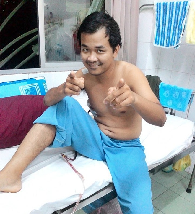 | Trong thời gian nằm trên giường bệnh, thầy giáo 8X vẫn giữ nụ cười tươi vì không muốn mọi người lo lắng, buồn phiền về mình. |