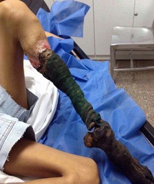 Một bé gái (13 tuổi, giấu tên) ở Venezuela đã gặp phải sự cố khủng khiếp sau khi bị rắn cắn. Chân trái của bé gái đã bị hoại tử và biến dạng khủng khiếp do những người dân trong làng đã tự ý chữa trị bằng những phương thuốc lạ.