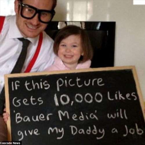 | Dan Conway và cô con gái 2 tuổi giơ tấm bảng: "Nếu bức hình này nhận được 10.000 like (lượt thích), Bauer Media sẽ nhận cha cháu vào làm việc". |