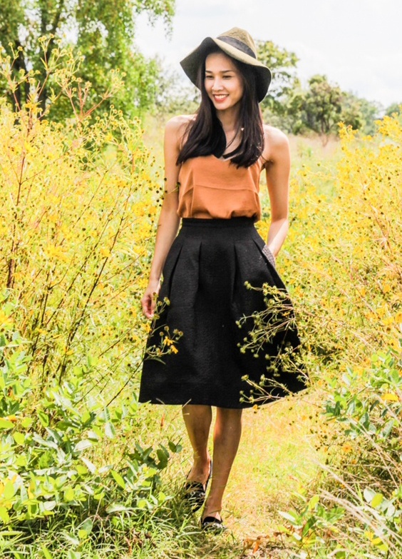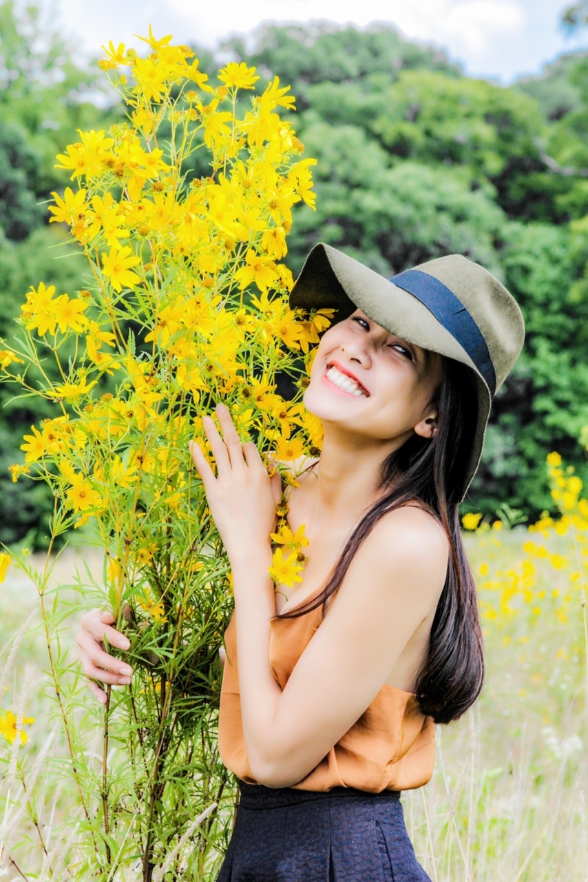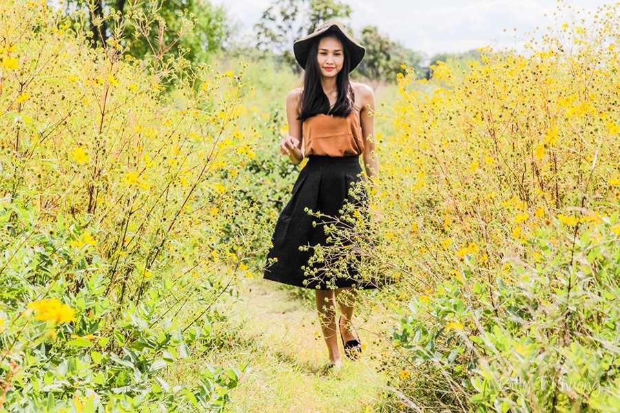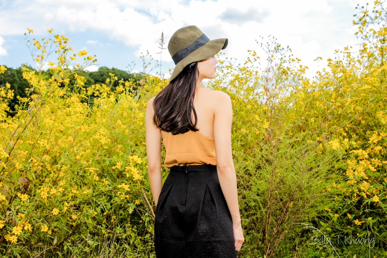 | Vốn là người yêu thiên nhiên, người đẹp chọn bối cảnh chụp là đồng vắng đầy hoa cúc vàng mướt mát. |
