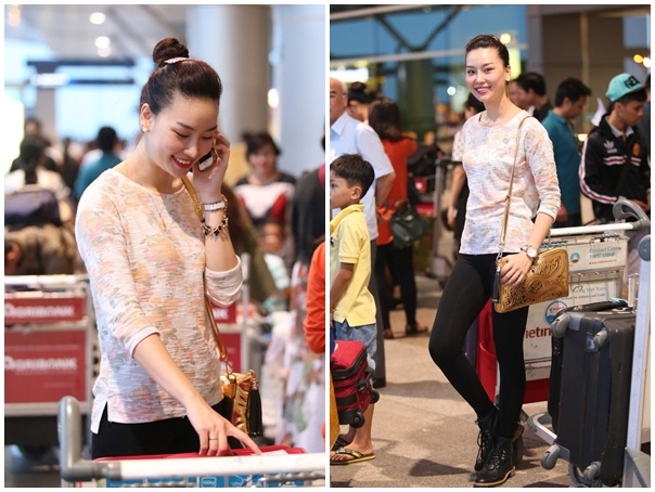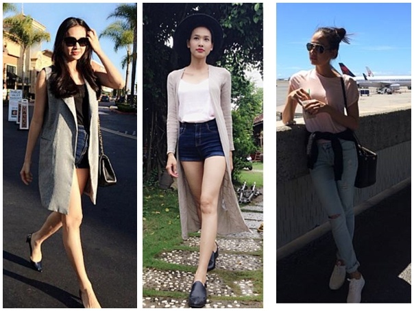 | Hoa hậu qua ảnh trung thành với gu thời trang kín đáo, trang nhã. Khi đi du lịch, cô thường chọn trang phục gam màu tối trầm. |