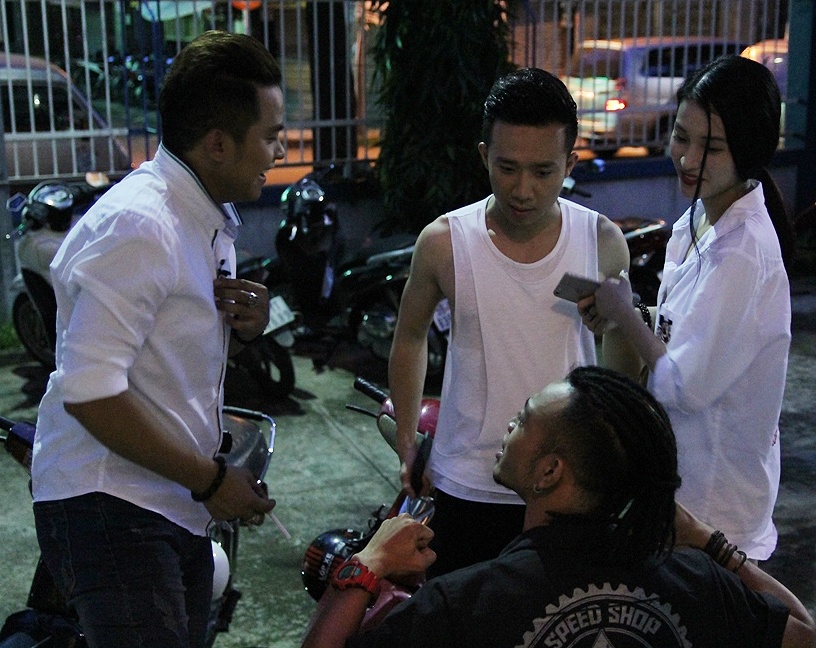 Mai Hồ diện mốt giấu quần khi tới trường quay cùng Trấn Thành. Cô chăm chú ngồi theo dõi anh trang điểm, làm tóc chuẩn bị cho vai diễn. Trước đây, Mai Hồ và diễn viên Trùm cỏ từng vướng nghi vấn yêu theo hợp đồng. Tuy nhiên, theo Trấn Thành, đó chỉ là "một tin đồn vô căn cứ làm tổn thương rất nhiều đến cả tôi và bạn tôi".