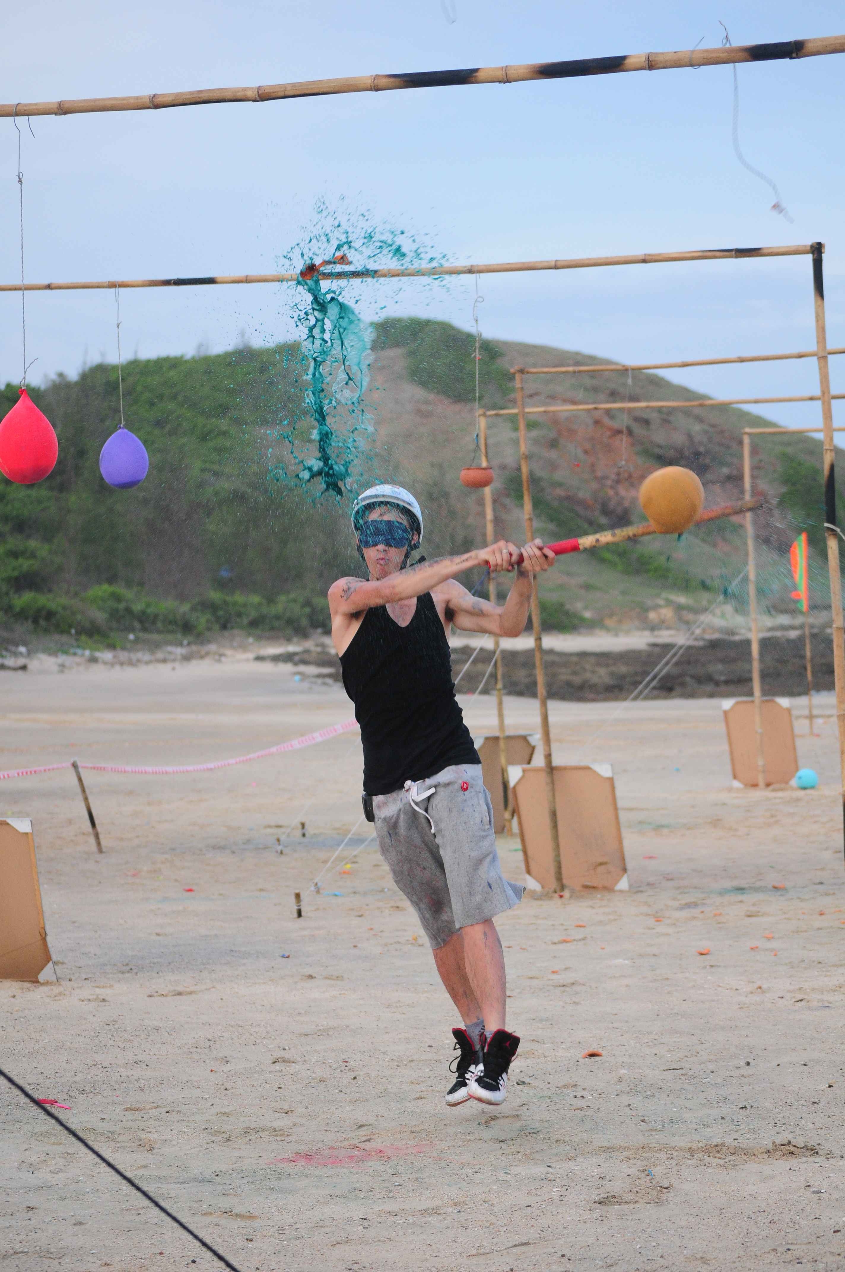 | Kim Lee căng thẳng khi hướng dẫn cho đồng đội trong phần thi Bịt mắt đập niêu. |
