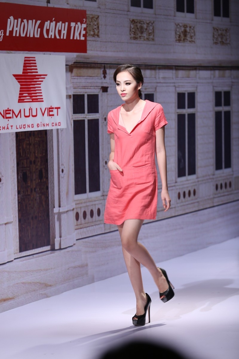 | BST của NTK Lâm Thuận có sắc màu trẻ trung, phù hợp với không khí mùa hè. Người mẫu Thùy Linh thể hiện mẫu trang phục tông màu cam hợp xu hướng. |