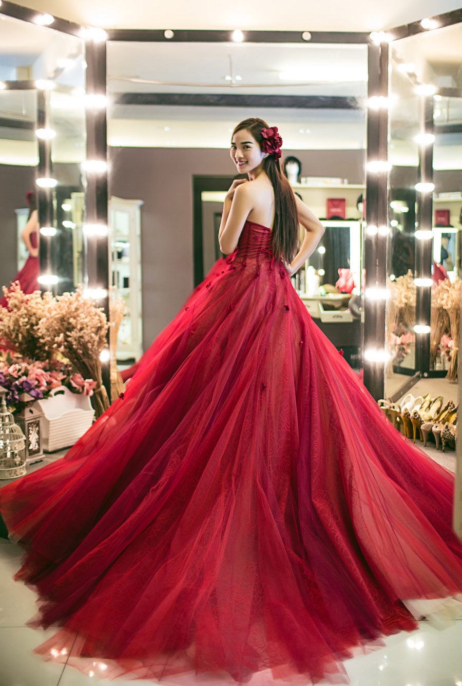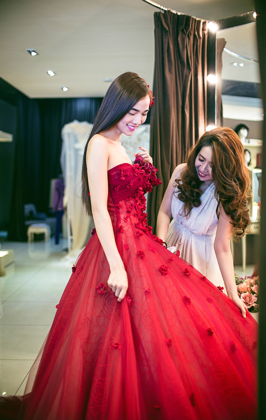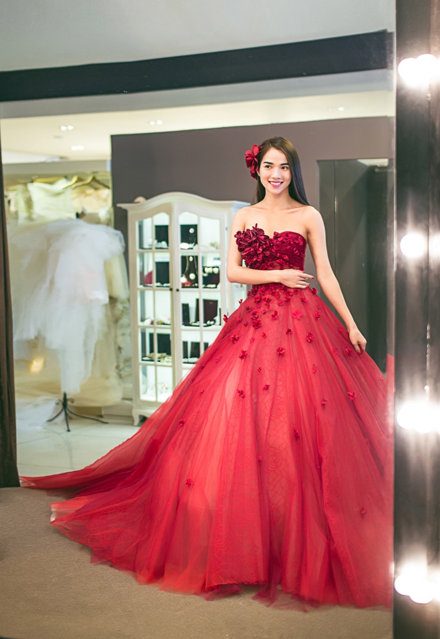 | Ngày 11/4, Kim Cương đã có buổi thử trang phục tại showroom của NTK Anh Thư. Nữ người mẫu ướm thử một số trang phục sẽ trình diễn. Trong đó, nổi bật nhất là mẫu váy đính hoa 3D cầu kỳ tại thân áo. Tông màu đỏ làm nổi bật làn da trắng hồng của cô.