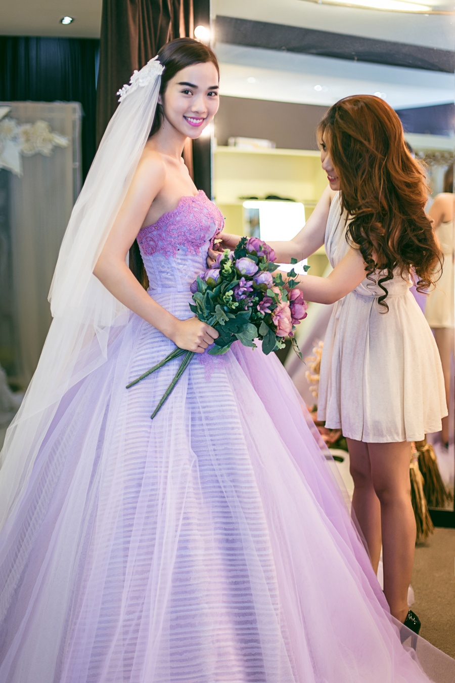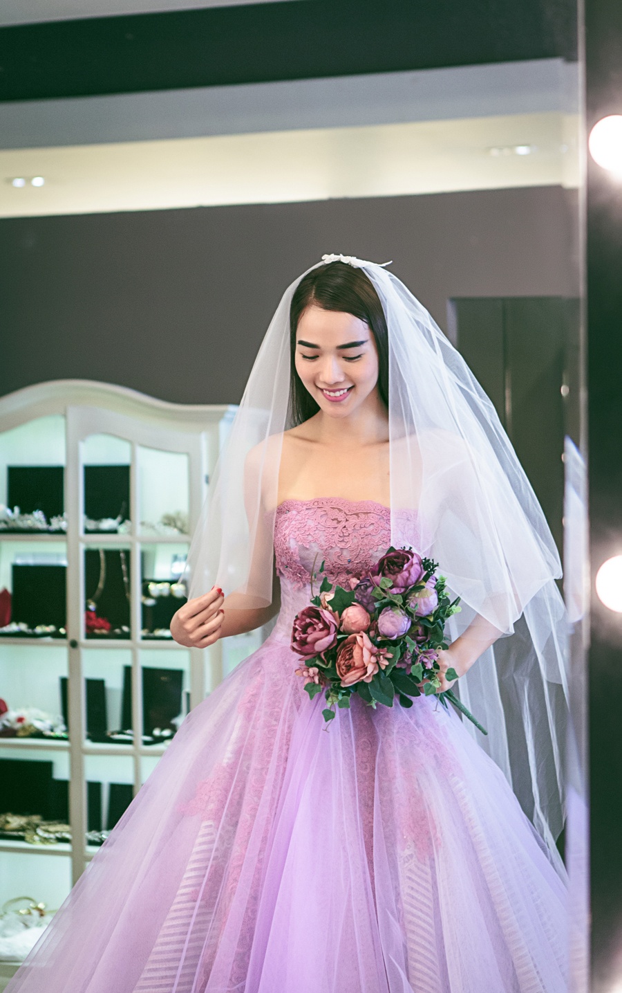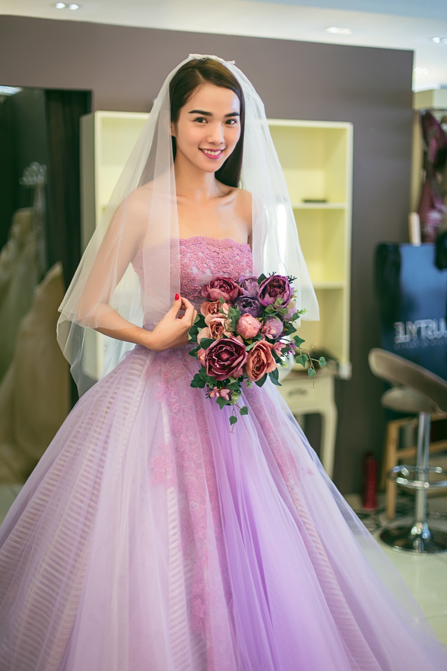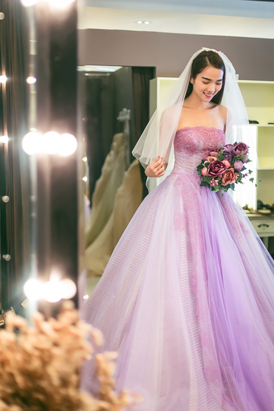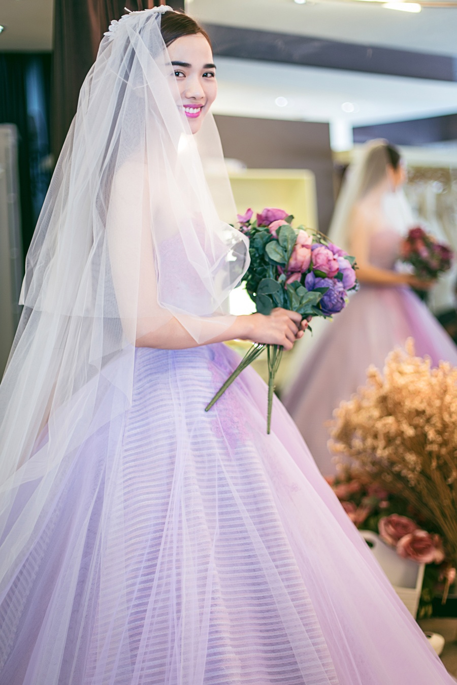 | Đi kèm váy cưới tím là khăn voan trắng, bó hoa tím nhẹ nhàng phù hợp.