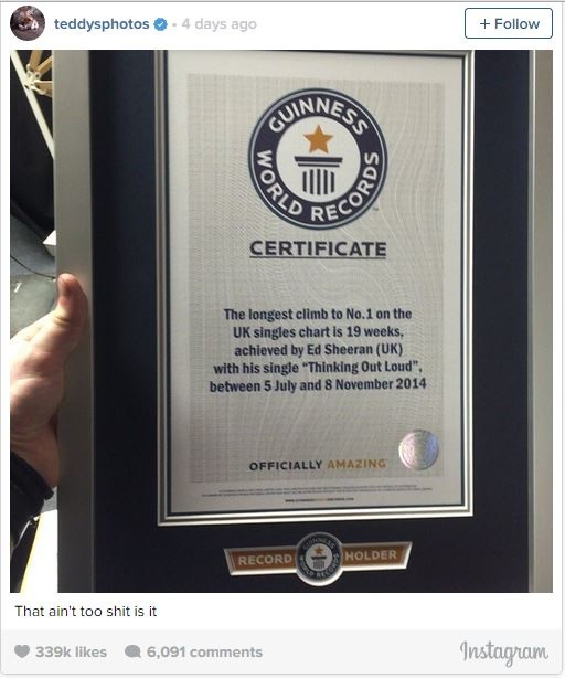 | Ed Sheeran hài hước khoe với người hâm mộ về kỷ lục Guinness cuả Thinking Out Loud. |