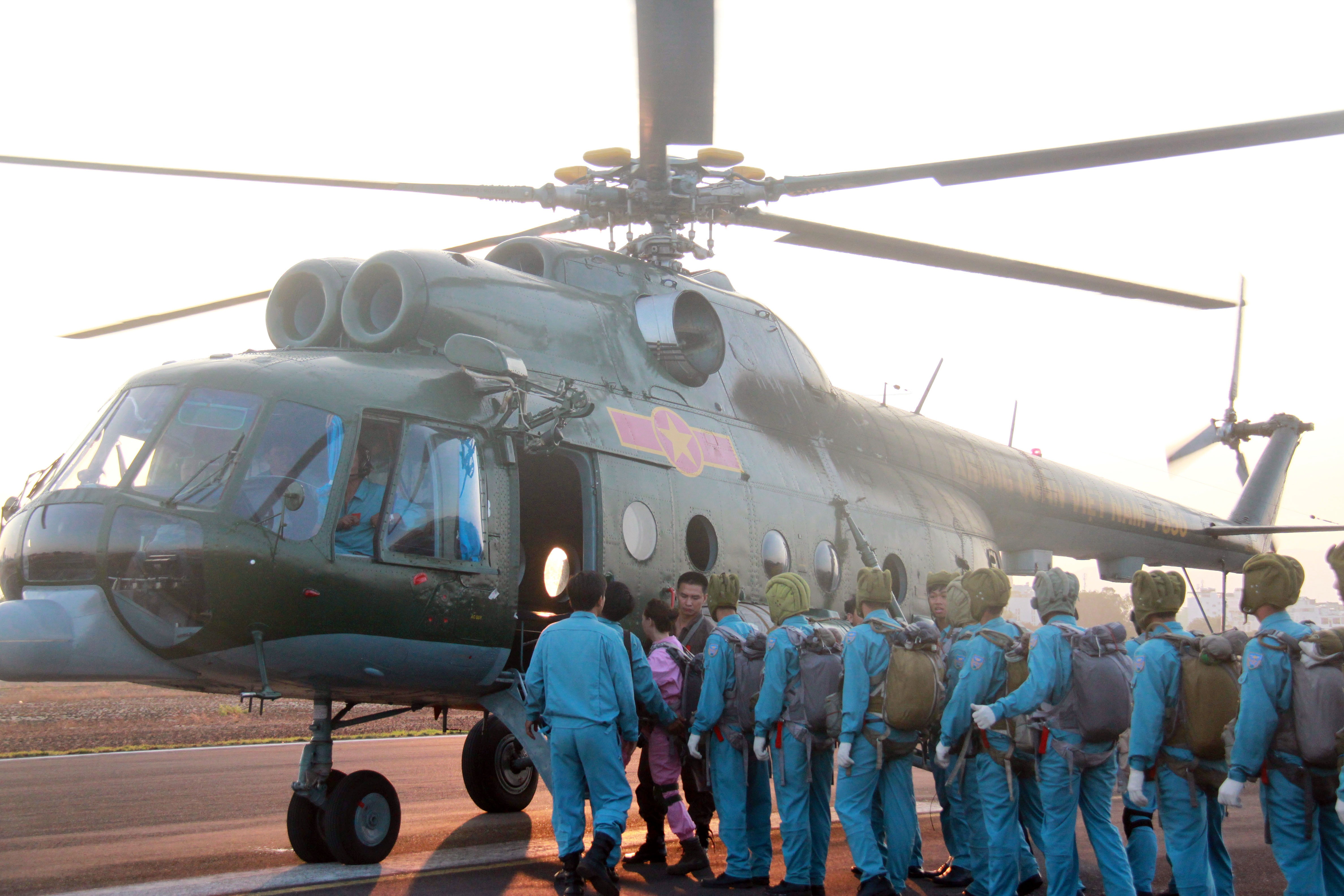 | Trực thăng đón học viên và phi công chuẩn bị chuyến nhảy dù. |