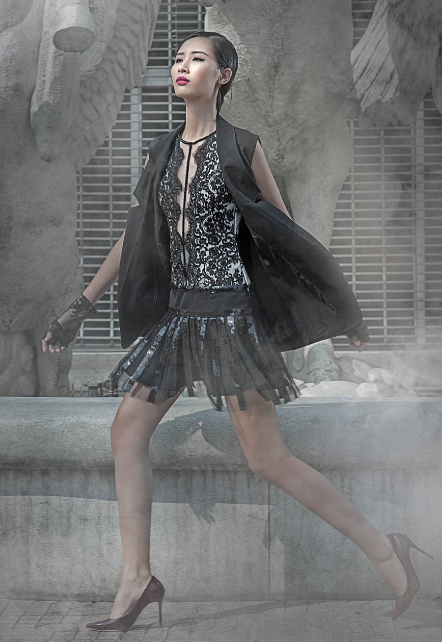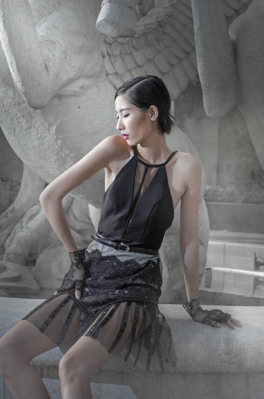 | Trong bộ ảnh mới, Hằng Nguyễn thể hiện BST mùa xuân hè của NTK Nguyễn Hà Nhật Huy. Trang phục có tông màu chủ đạo là đen, điểm trắng, chất liệu thiết kế là voan ren, tạo những khoảng hở gợi cảm ở thân áo, chân váy. |
