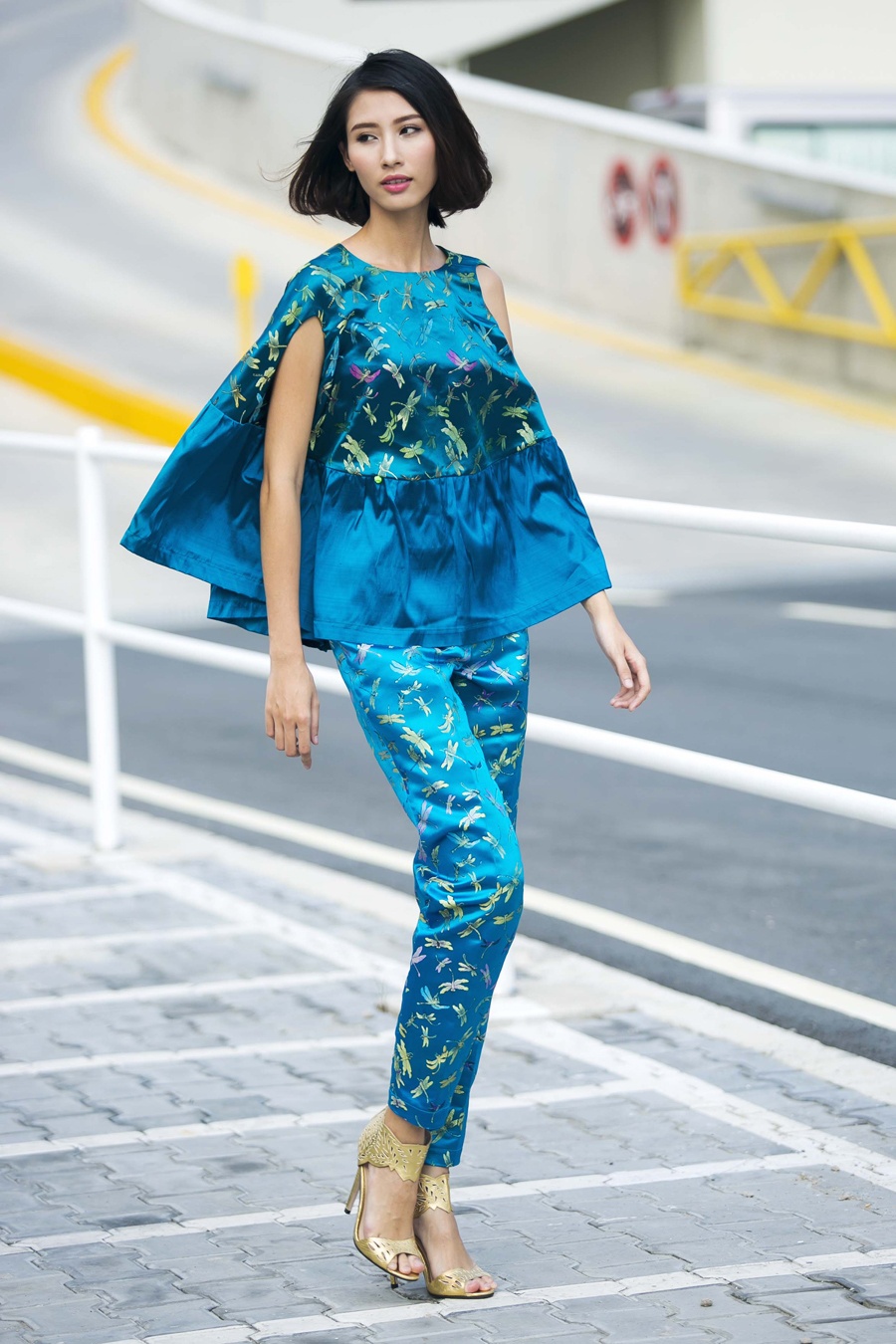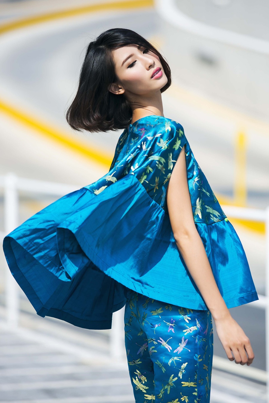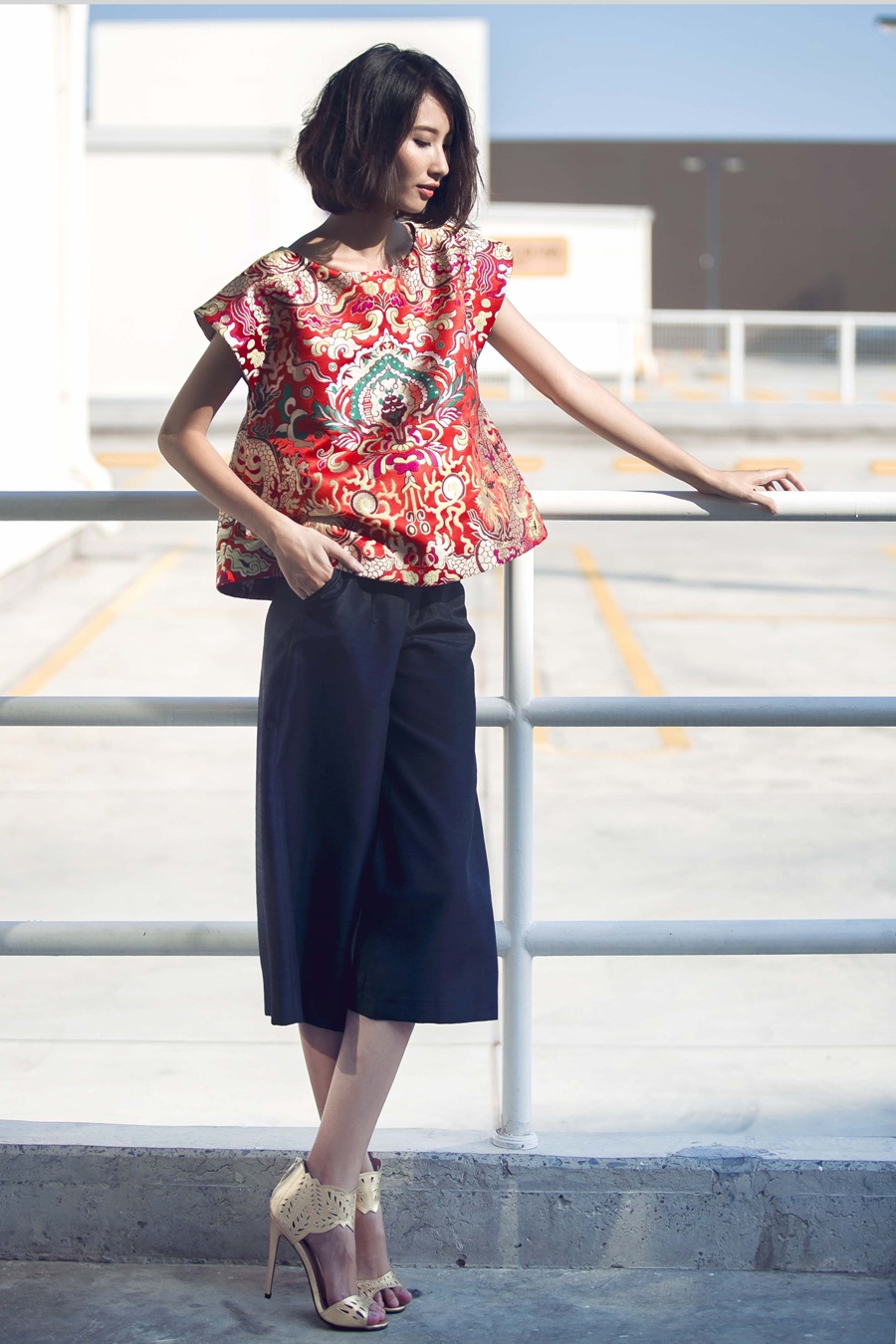 | Ngoài dáng váy, đầm rộng, nhà thiết kế còn đặc tả ở mốt áo xòe, mix ăn ý cùng quần lửng. Chất liệu vải gấm sở trường tiếp tục được Thủy Nguyễn mang vào bộ sưu tập lần này. |
