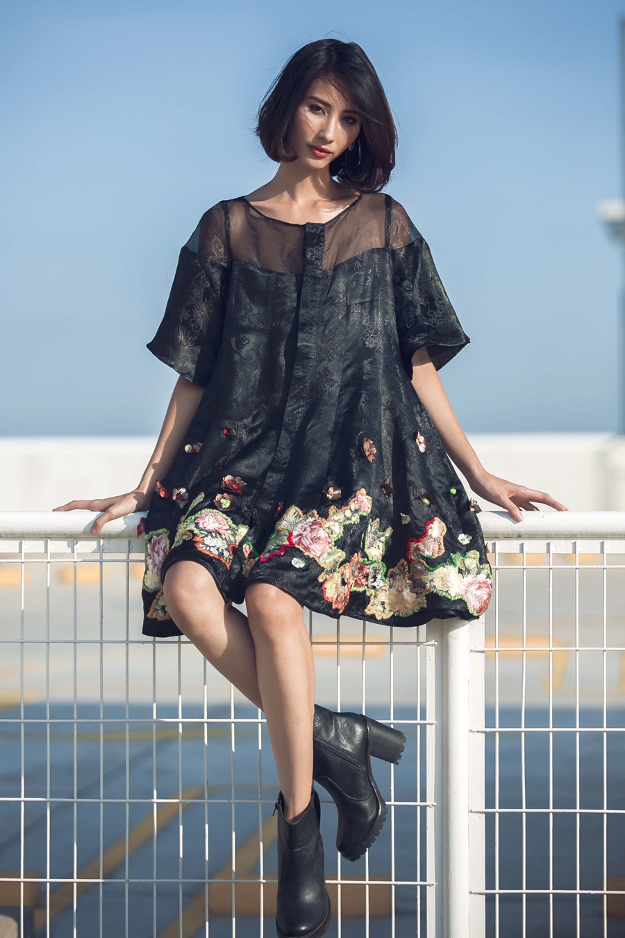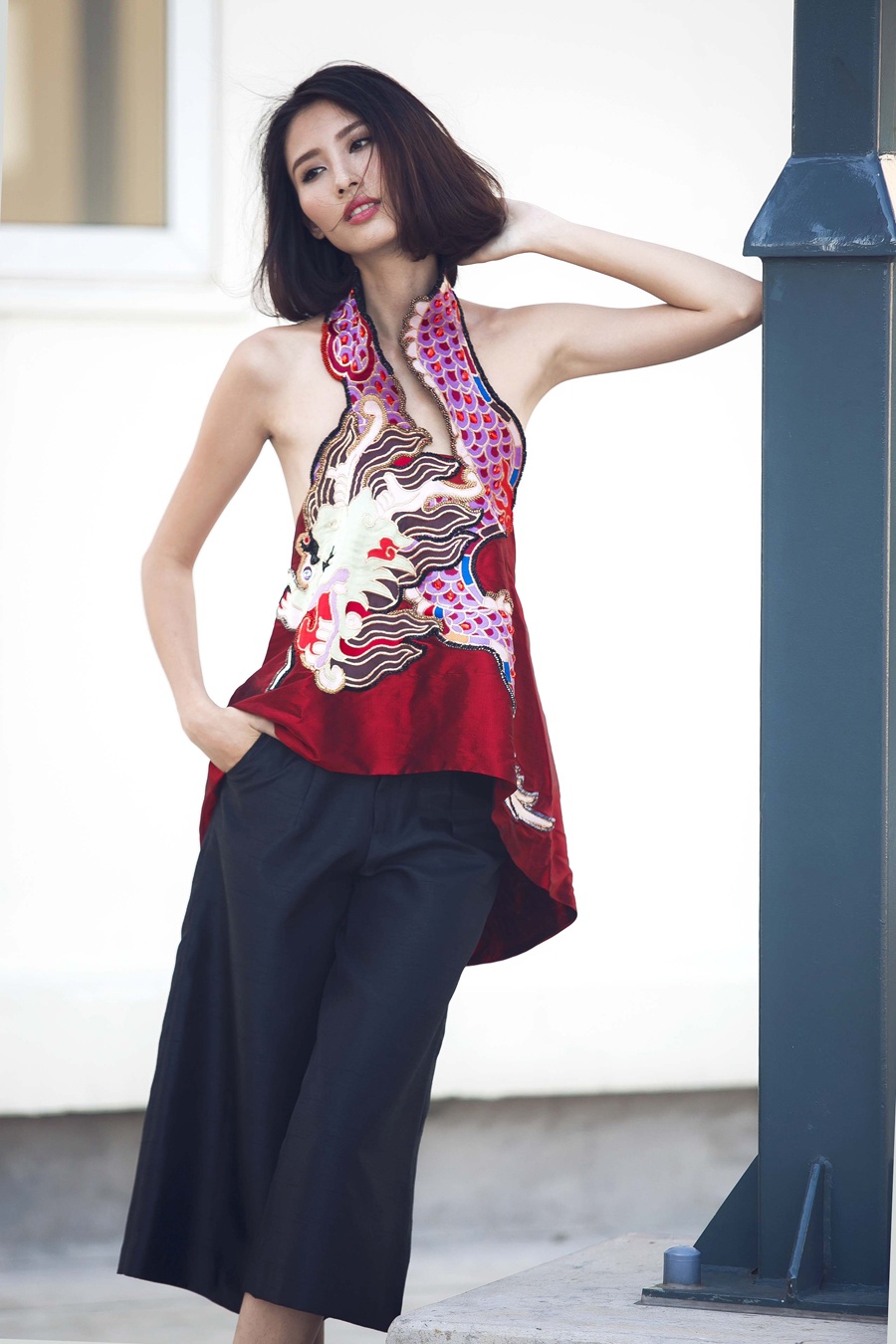 | Bộ cánh họa tiết thêu diềm quanh gấu váy rất tinh tế, hoa văn được in chìm khéo léo trên nền vải tối màu. Bộ ảnh được thực hiện bởi nhiếp ảnh Khoa Nguyễn, stylist Phạm Bảo Luận, trang điểm Beo (Tâm Đặng). |