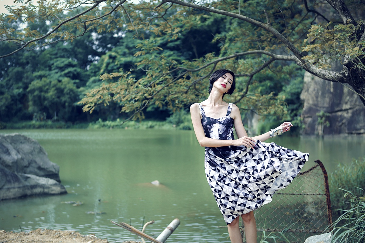| Họa tiết hình học mix cùng họa tiết hoa mùa thu mang đến vẻ thanh lịch, phá cách cho bộ váy mùa hè. Giúp người mẫu nổi bật giữa không gian mùa thu sâu lắng. |