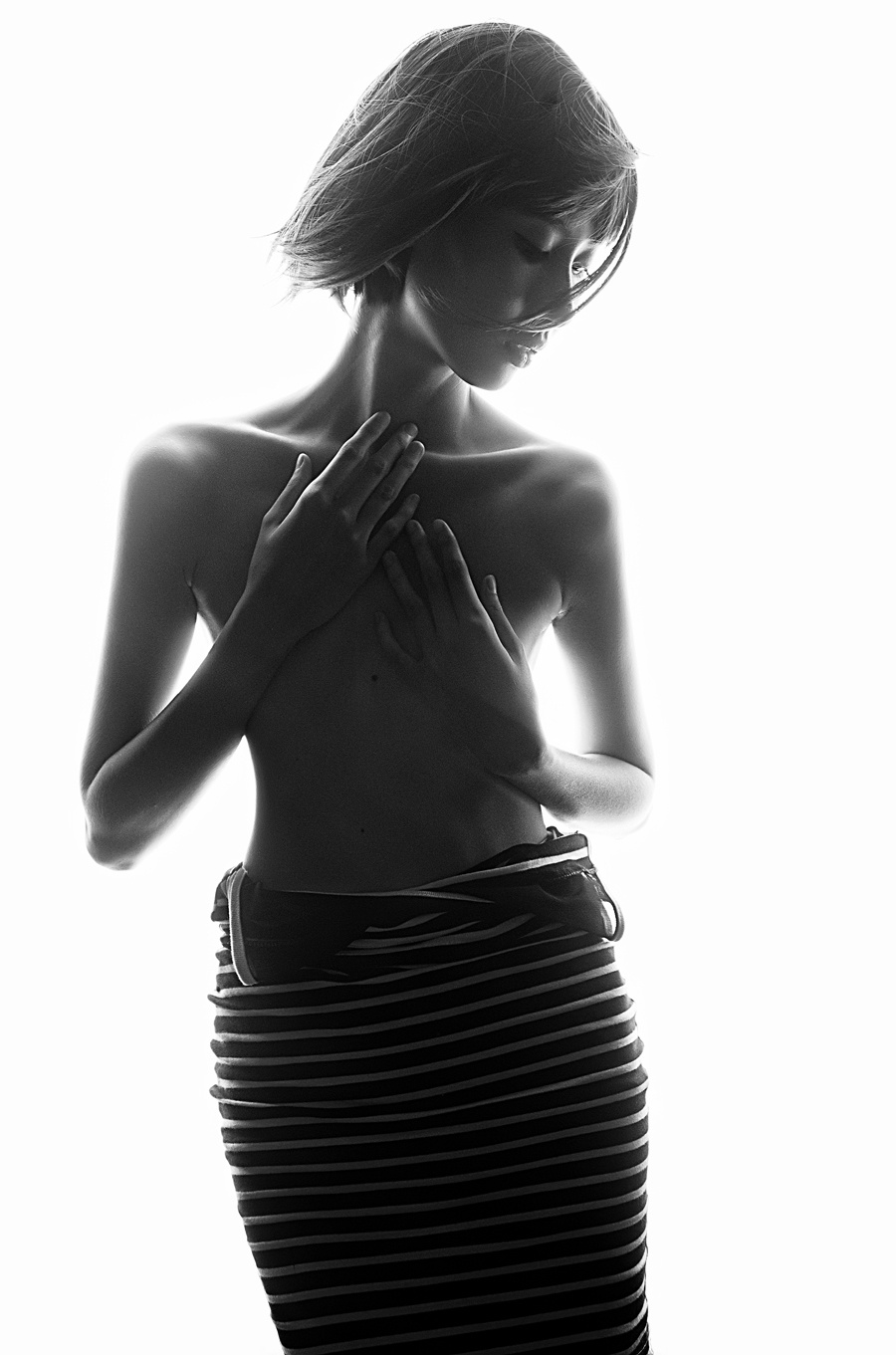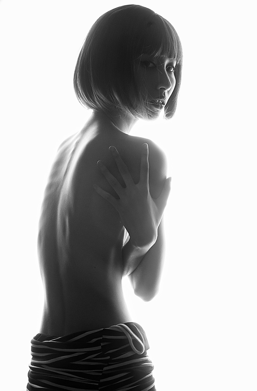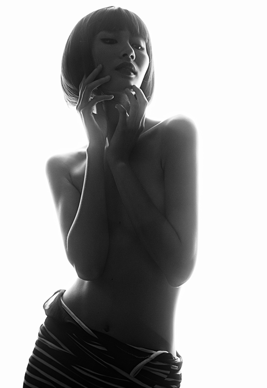 | Nữ người mẫu 21 tuổi dùng tay che khéo vòng 1 nhỏ nhắn, tạo hình ảnh đậm chất nghệ thuật. |