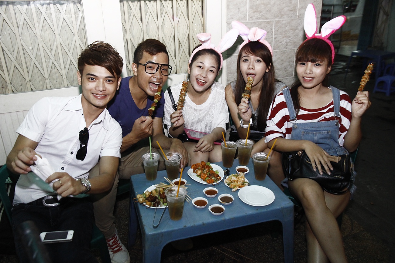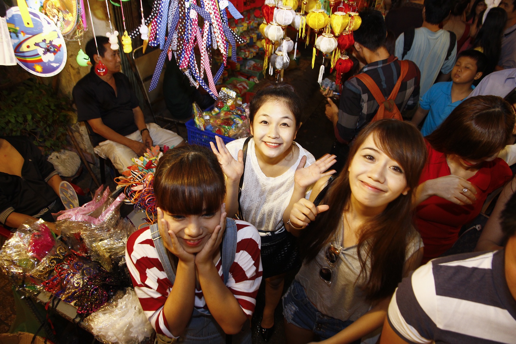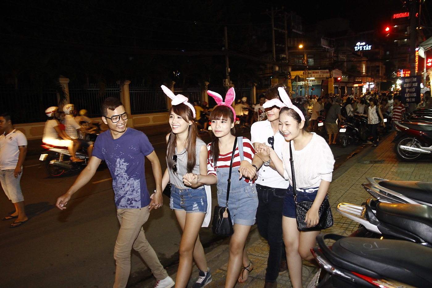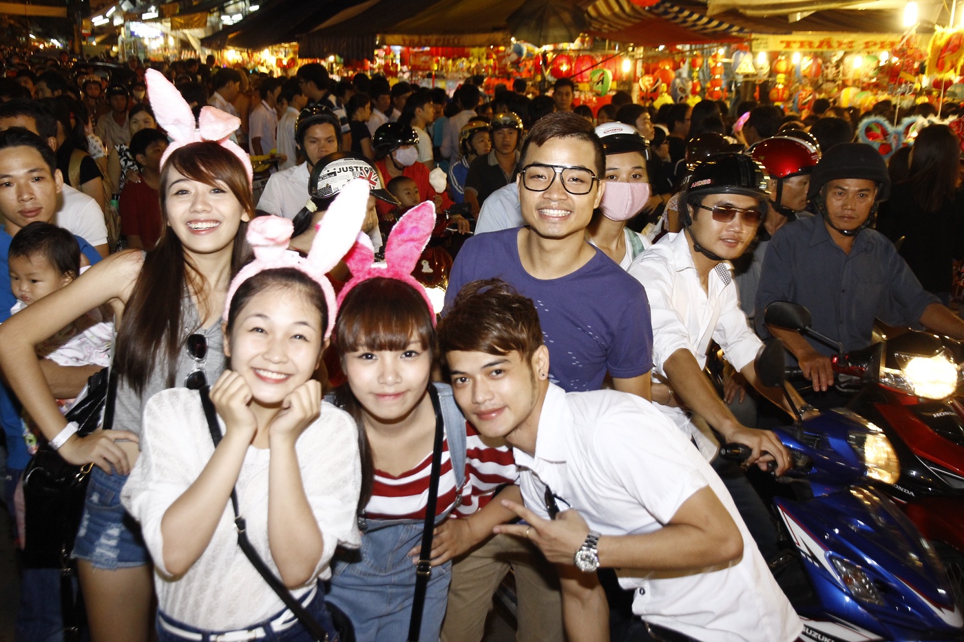 | Văn Viết và Thái Quang tháp tùng các cô gái giữa biển người của phố đèn lồng. |