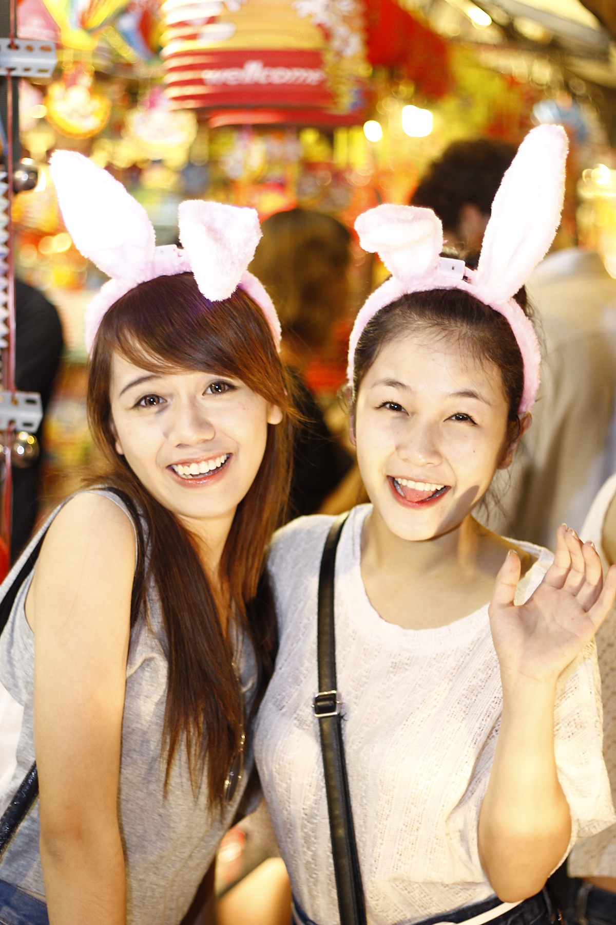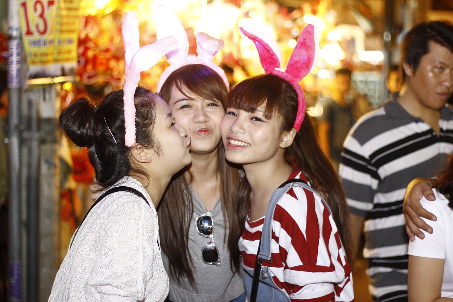| Ba hot girl của hai đội cùng chu môi tạo dáng dễ thương trên phố đèn lồng của TP.HCM. |
