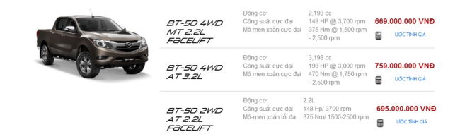 Cũng được trang bị với khối động cơ này, bản BT-50 2WD AT 2.2L được bổ sung một số tính năng khác có mức giá 695 triệu đồng. Phiên bản cao cấp nhất BT-50 4WD 3.2L, với khối động cơ này cho công suất lên tới 198 mã lực và mô-men xoắn 470 Nm và có mức giá lên tới 759 triệu đồng.